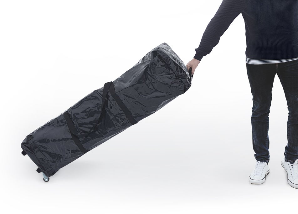 Included in the delivery: frame, cover fabric, wheeled transport case, user manual, and ground anchors and ropes. We recommend adding walls and 8–16 metal or reinforced concrete weights that are available as accessories.